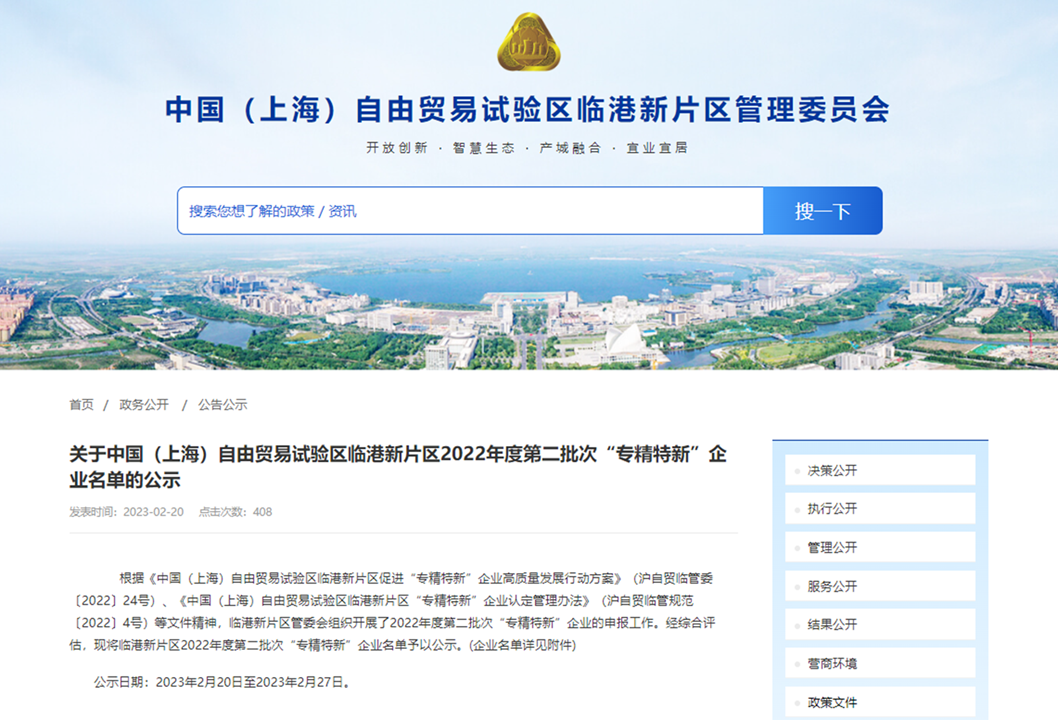 喜報(bào)|研究院成功入選臨港新片區(qū)“專精特新”企業(yè)