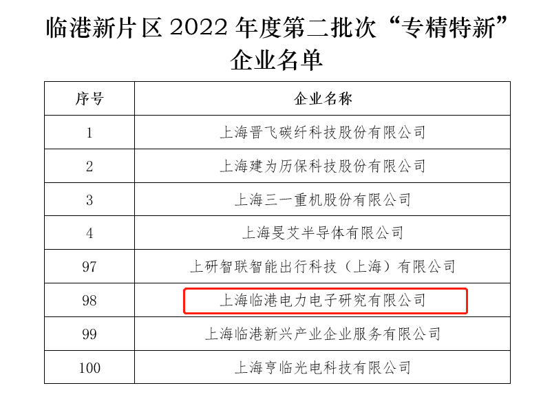 2月20日,臨港新片區(qū)管委會(huì)公示了2022年度臨港新片區(qū)第二批次“專精特新”企業(yè)名單,上海臨港電力電子研究院榜上有名。