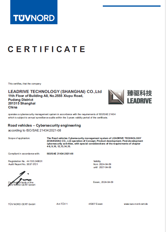 2024年5月11日,臻驅科技(上海)有限公司(以下簡稱“臻驅科技”)正式通過《ISO/SAE 21434道路車輛-網絡安全工程》(以下簡稱“ISO/SAE 21434”)汽車網絡安全管理體系認證,獲得此證書標志著臻驅科技已經建立了完整的汽車網絡安全管理體系,具備了產品網絡安全開發和管理能力,是公司體系建設中又一關鍵里程碑。
