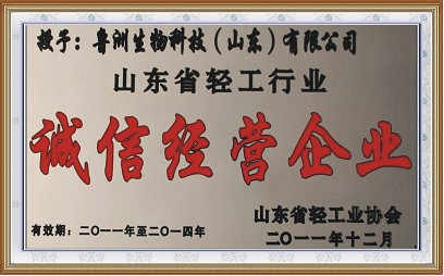 1月10日,山東省輕工業協會在濟南召開全省輕工業工作會議,對在“ 誠信山東”建設工作中做出貢獻的誠信經營企業進行表彰,會上,魯洲生物科技(山東)有限公司被授予“山東省輕工行業誠信經營企業”并頒發了獎牌。
